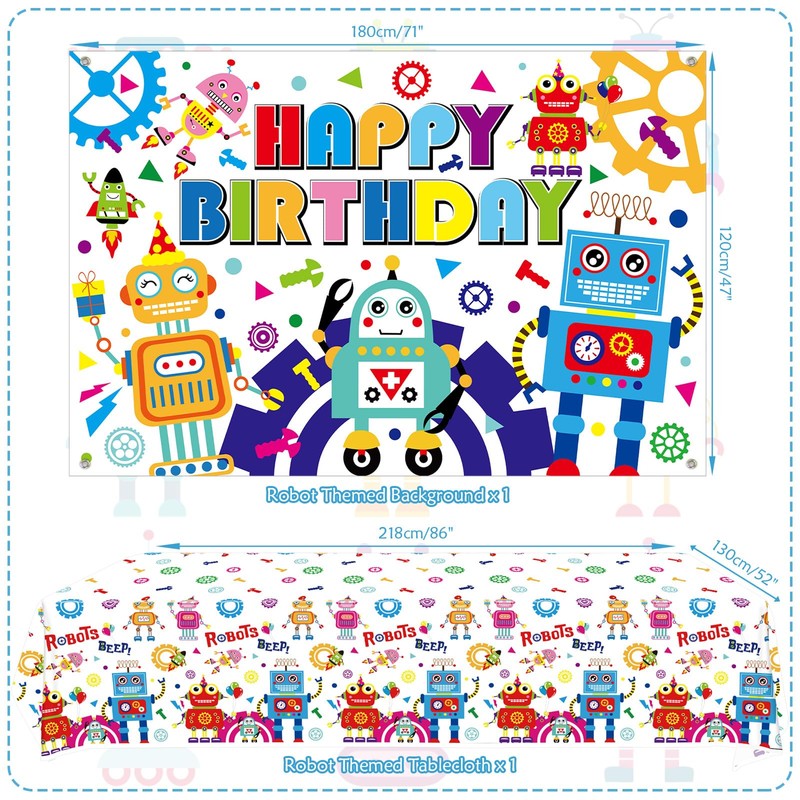 - Robot Birthday Party Decorations: Our Robot birthday party supplies set includes a happy birthday backdrop, tablecloth, cake topper, cupcake topper, tableware, and balloons. Kids will be surprised and impressed with your unique party.