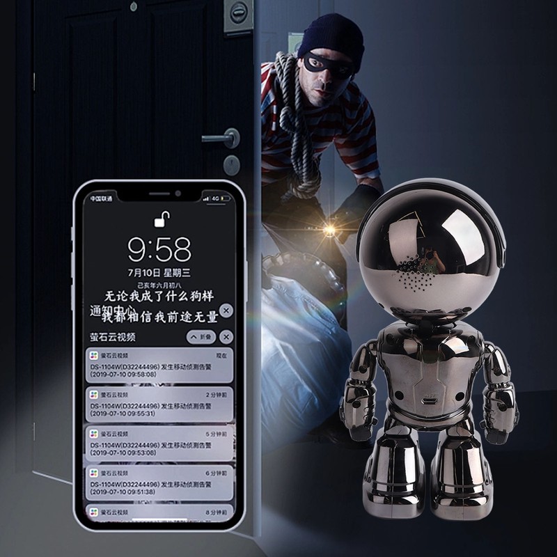 1、Robot camera: Robot camera with electroplated metal color, cool with a sense of technology, can be used as a decoration, but also a security camera, provide remote mobile phone interaction function. 2、Automatic Human Body Tracking: Smart WiFi cameras will automatically identify and track moving objects and record when someone moves, providing higher security. 3、Smart Alarm: Once the camera detects an unusual situation, it will push alarm information to the app, and can monitor the home or office in real time. With speakers, you can scare off intruders by calling into your home with the app. 4、Pan and Tilt Monitoring: Our 1080P camera can rotate 355 degrees horizontally and rotate 45 degrees vertically, allowing you to see everything going on in the room. 5、Cloud Storage and TF Card Storage: The camera supports 7×24 hours cloud storage, not afraid of file loss, viewing video content anytime and anywhere. TF card supports up to 128G storage card, you can store videos for later viewing.