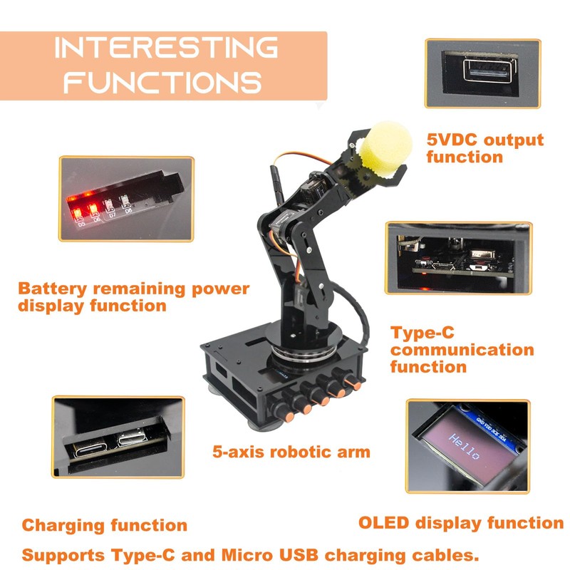 - OLED Display:The robot arm kits with OLED display, you can DIY your own desired patterns for fun while learning. The robot arm kits come with a charging function and a display of remaining power.