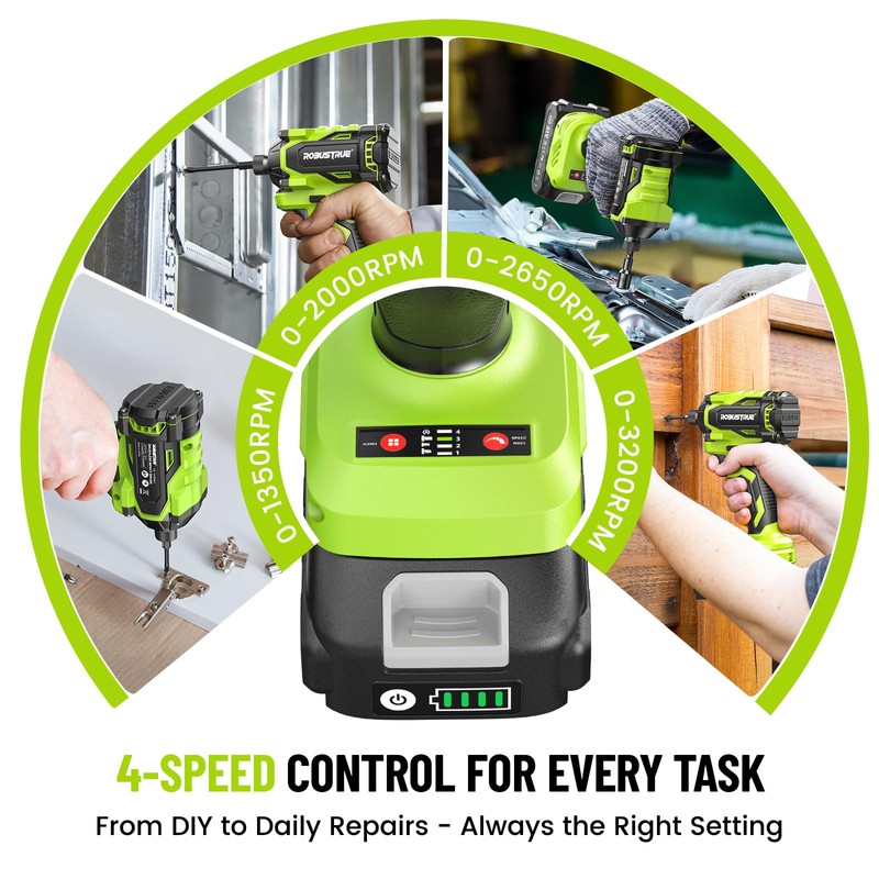 - 【Forward/Reverse with Smart Loosen Speed-Down】 – The one-touch direction switch allows easy driving and removal of fasteners. In reverse, the driver automatically slows as bolts loosen, maintaining controlled power to prevent spin-out or accidental drops, ideal for wheel nuts, machinery, and assembly work.