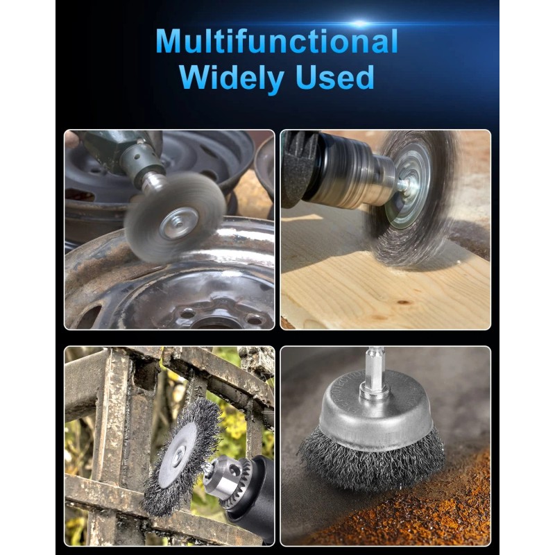 6 Pack Wire Brush Set: This package includes: 2 pcs carbon steel cup brush, 2 pcs wheel brush, 2 pcs pen brush with 1/4 inch hex shank. Hardened steel wire long maximum 4500 RPM.