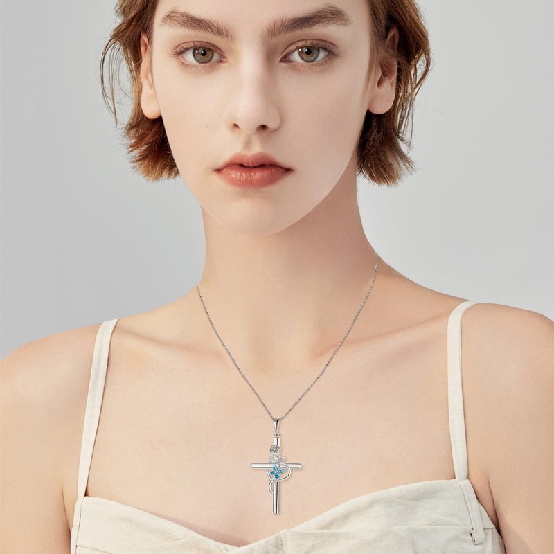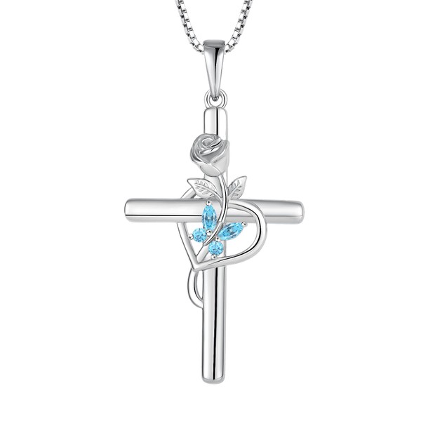 Rocayi Cross Necklace for Women 925 Sterling Silver Butterfly Necklace Aquamarine March Birthstone Pendent Rose Flower Religion Jewelry Gifts for Women Wife Girlfriend Mother Daughter Her