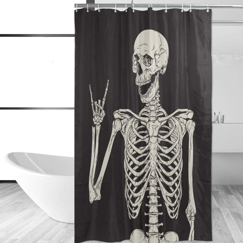 Rock And Roll Skull Skeleton Bone Love Music Shower Curtain Polyester Waterproof, Sugar Candy Skull Day Of Dead On Black Backdrop Bath Room Shower Curtain with Hooks 60 W x 72 H inches