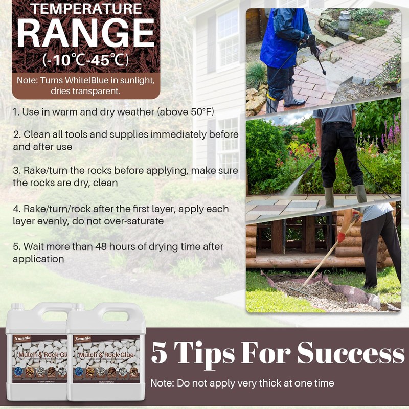 - EASY LANDSCAPE MAINTENANCE: Are you tired of having to constantly sweep up loose mulch, gravel, and messy gardens? Say goodbye to a messy yard now! Xmntdo Rock Glue eliminates the hassles of overgrown weeds, frequent sweeping, and expensive gardener fees. Keep your landscape in place and tidy, and you can enjoy a pristine, low-maintenance landscape all year round.