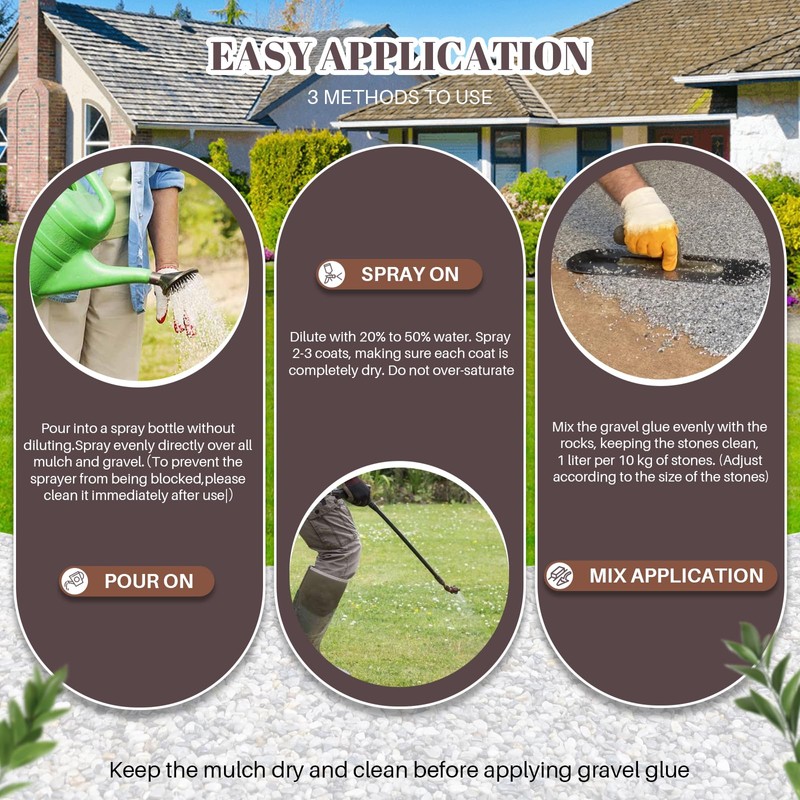 - LANDSCAPE KEEPER: Mulch glue firmly covers a variety of landscapes, including rocks, wood chips, crushed stones, sand, shells, pine needles, pebbles, etc., with a strong and lasting bond that can stick firmly even in inclement weather. Our mulch glue prevents displacement caused by wind and rain, and provides strong protection for slopes and uneven surfaces.