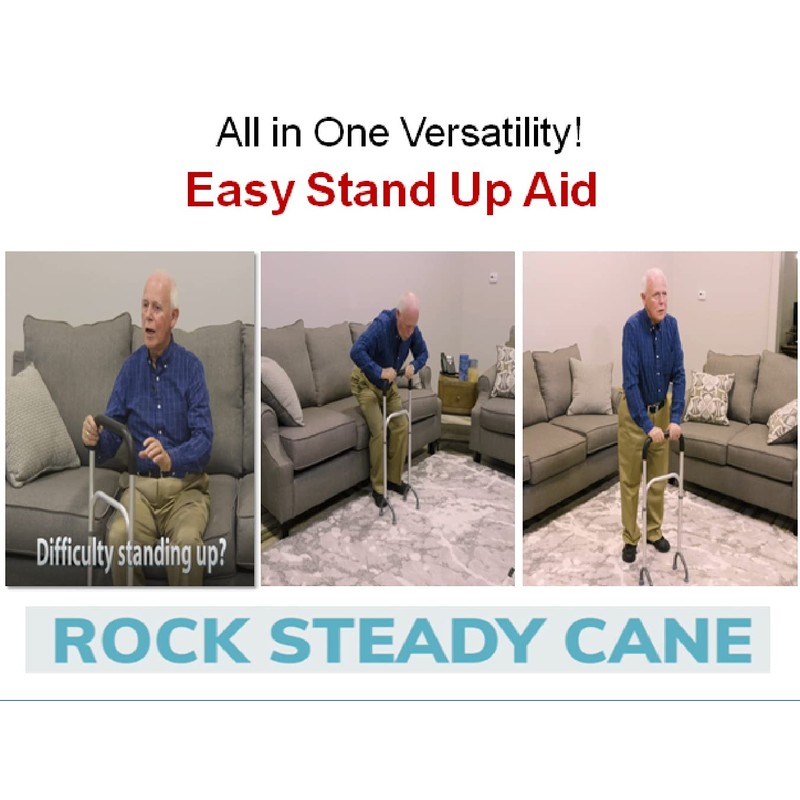 - SELF-STANDING WALKING CANE AND STAND ASSIST AID – the 100 sq inch footprint forms a solid foundation that replaces many aids. NOTE FOR STAND ASSIST - Position the Rock Steady Cane in front of you, grip the handle with two hands, lean and shift your weight forward and push down with your hands. DO NOT PULL FROM A SIDEWAYS POSITION OR IT MAY TIP as will any walking aid.
