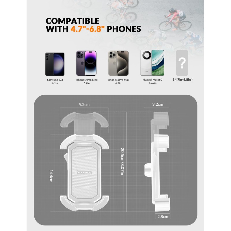 - [UNIVERSAL FITS]: Suitable for phones with a length of 4.7-6.8 inches and a thickness of 10mm or less. Support iPhone, Samsung, Google Pixel, LG, etc. The bracket base of the bicycle phone holder is suitable for handlebars with a diameter of 18-28mm