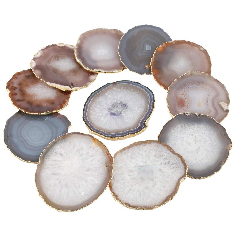**Perfect for under any glass,our sliced agate place card sets are made of sliced, polished agate.Each of the handmade agate coasters possess a unique shape and pattern of naturally occurring rings. Functional art for your table top– these unique agate slices will make a statement wherever they are placed. Perfect for jewelry making and any other craftwork. Due to the coasters are dyed of nature agate,should keep away from water,each stone may vary slightly in shape and color.**
