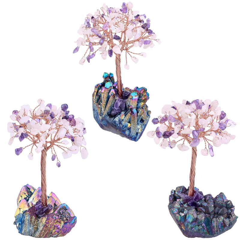 rockcloud Crystal Money Tree Feng Shui Bonsai with Titanium Coated Crystal Quartz Base Decoration for Wealth and Luck, Amethyst & Rose Quartz