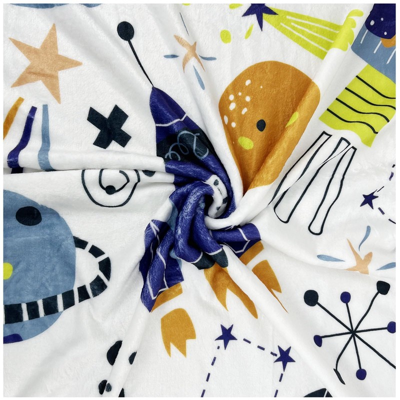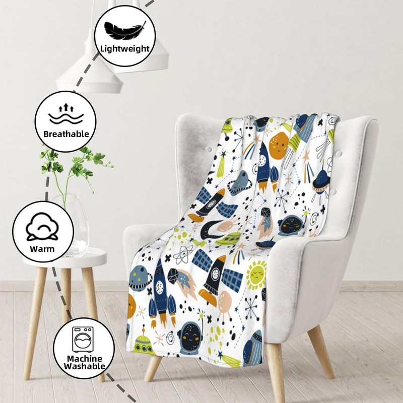 - Exquisite design: one side of the children's blanket on the theme of space is printed with cute cartoon planet, galaxy, rocket, satellite and star, and the other side is a white plush blanket that is comfortable and warm. Suitable for all seasons. It is perfect for children and teenagers.