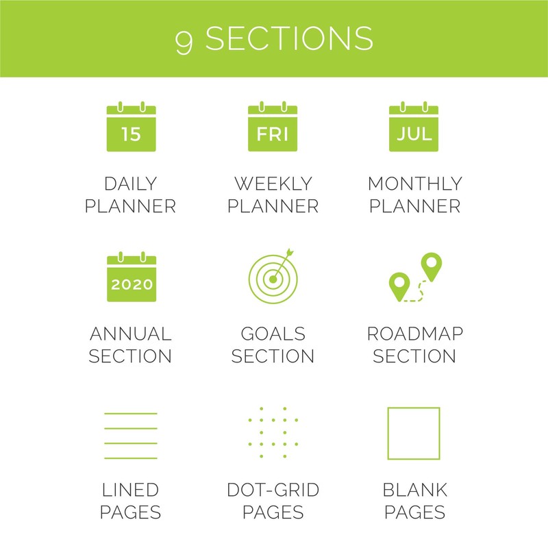 • FIVE SECTIONS, ENDLESS PRODUCTIVITY - The Goals section helps you plan quarterly/annual goals. The Monthly section has classic month-overview. The Weekly Section helps you reflect on the past week and optimize the next 7 days. The Daily section is where your day-to-day tasks will go. Finally the Notes section has dotted, lined and blank pages for whatever you need.