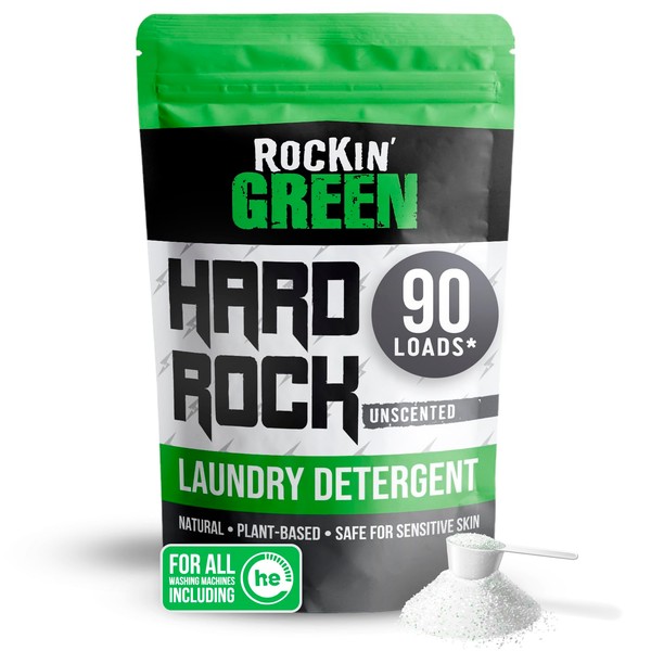- Formulated For Hard Water - Hard Rock Rockin Green laundry detergent fights tough stains and banishes odors while maintaining fabric quality. This natural laundry detergent works best in hard water with high mineral content, preventing residues and mineral deposits without the need for water softeners!