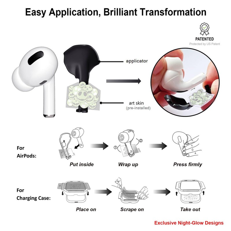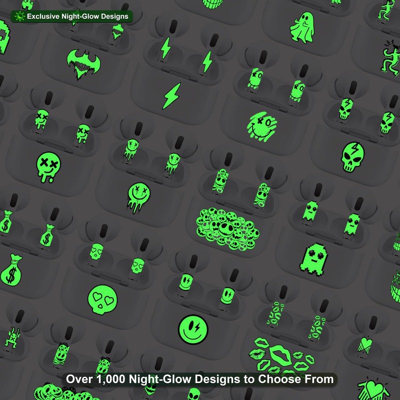 - PERSONALIZED ART SKIN FOR YOUR STYLE Give your AirPods 4 a custom, one-of-a-kind look. This glow-in-the-dark skin set allows you to express your individuality by customizing both your AirPods 4 earbuds and charging case. Available in a variety of stylish designs, it’s the perfect way to elevate your AirPods while adding a unique, vibrant glow.