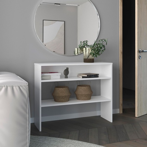 ROCKRAIN Library Desk 31.5" H with 2 Shelves - Modern White Wooden Study Table for Small Spaces & Home Office Use - Compact Storage Solution for Books & Workspace Organization