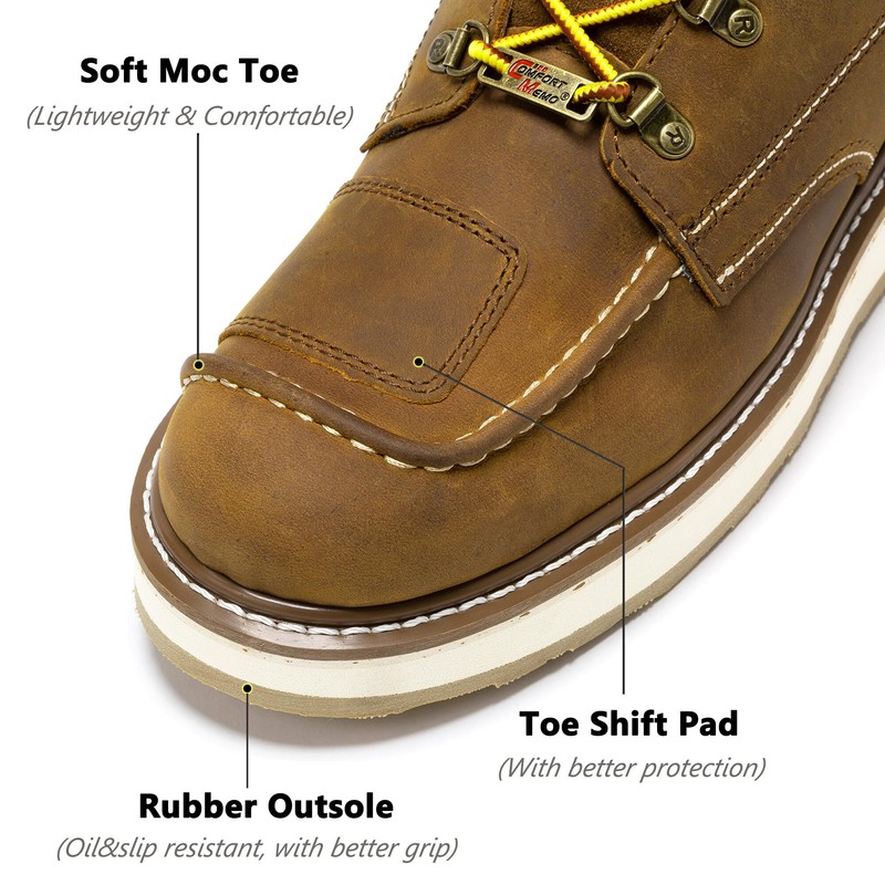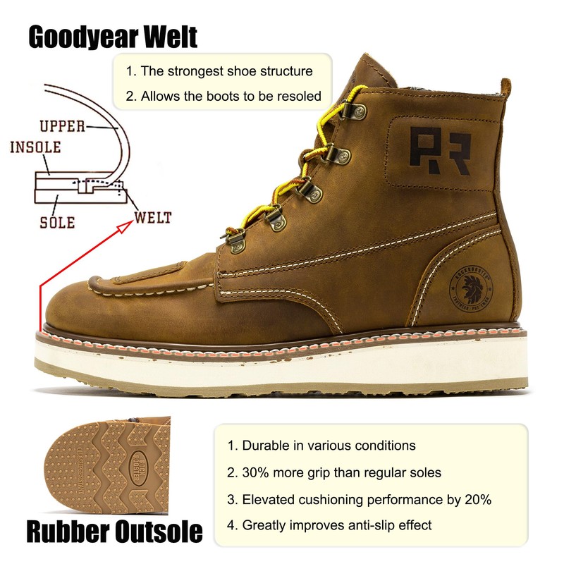 - 【Lightweight & Durable】Lightweight outsole and soft toe result in a boot weight of 1.95 lbs based on a size men's US 10. As is well-known, Goodyear welt construction is the most durable boot structure ever and allows the boots to be resoled multiple times without damaging the upper leather. Slip & oil resistant rubber outsole is more durable and with stronger traction.
