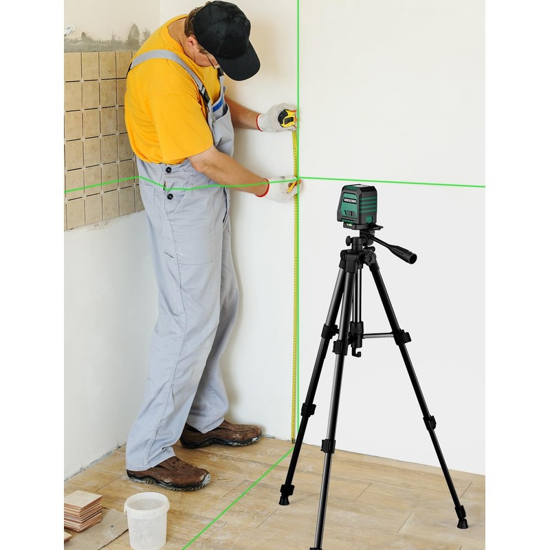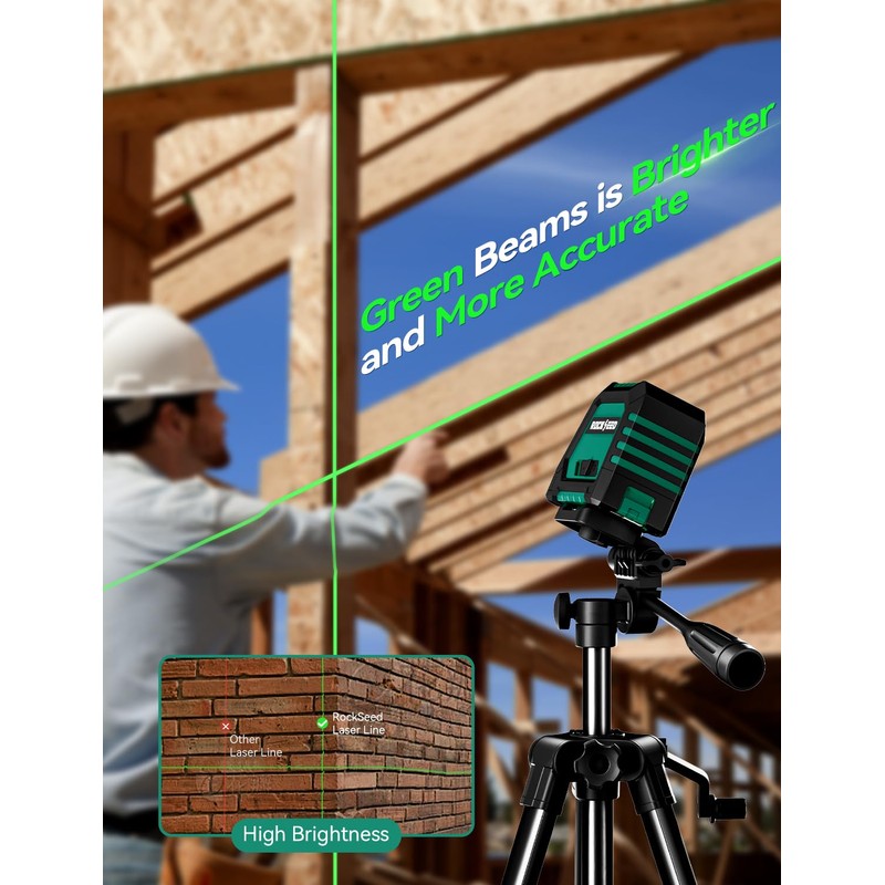 - ★ DUAL-MODULE GREEN LASER DESIGN ★ The laser level adopts two sets of high-precision green laser modules, with a brightness 50% higher than that of red light, providing stronger outdoor visibility. It supports simultaneous projection in both horizontal and vertical directions, achieving efficient multi-angle calibration.