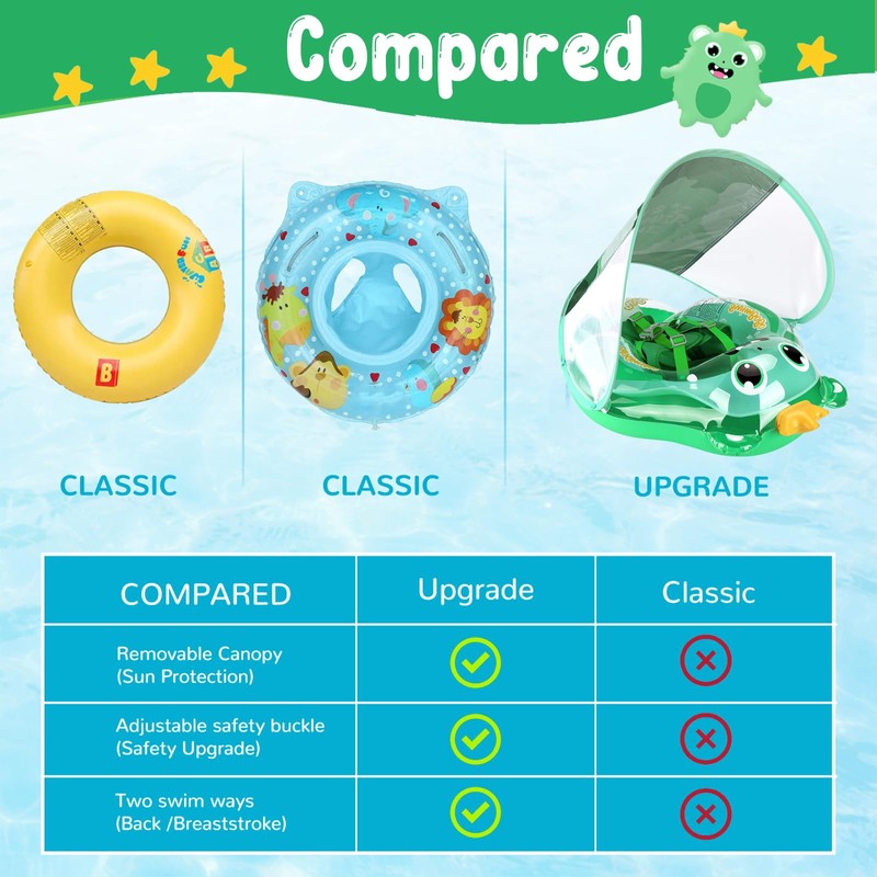 - Anti-flip design: safety first. Our 2025 Newer Model Baby Float offers multi-level safety protection so your child can splash safely with the rest of the family. An anti-flip tail, raised front and widened sides help keep baby afloat - as well as the two-layer air chamber, adjustable shoulder straps and secure fit. Buckle your baby in two ways for different swimming modes (breast swimming and backstroke). The soft floor support helps your baby learn to swim easily.