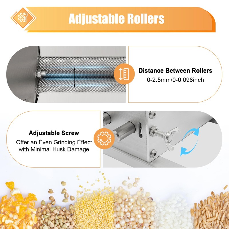 - Adjustable Roller Distance: By adjusting the screws, the gap between the two rollers can be adjusted(0-2.5mm) to the right position for an even grinding effect with minimal husk damage.