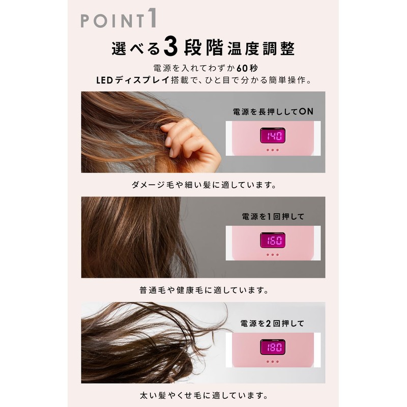 - 【3段階温度調整&60秒スピード加熱】 140℃・160℃・180℃の3段階に温度調整可能。髪質やスタイルに合わせて選べて、わずか60秒で立ち上がるスピード加熱も魅力。時短しながら、しっかりスタイリングできます。