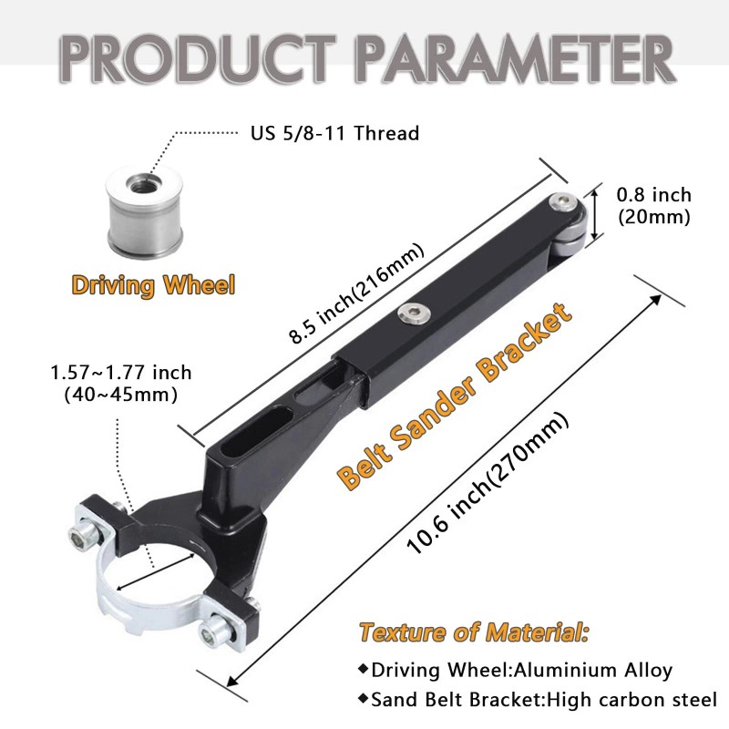 Sturdy and Durable: The belt sander bracket is made of thickened high carbon steel, which is sturdy and durable.bracket of the angle grinder sanding attachment is built-in high-strength spring, which can tighten the sanding belt during operation to avoid slipping.