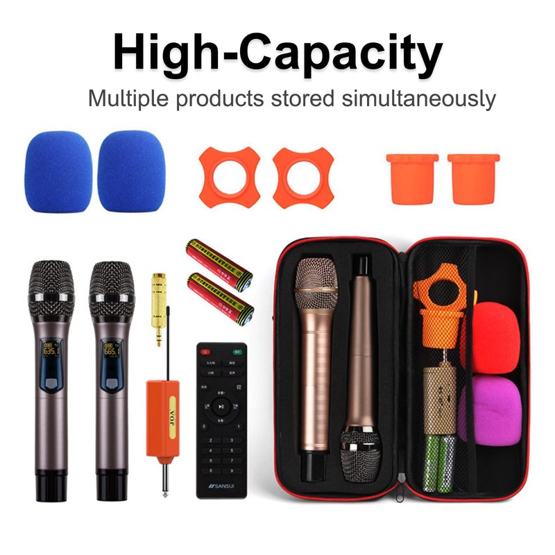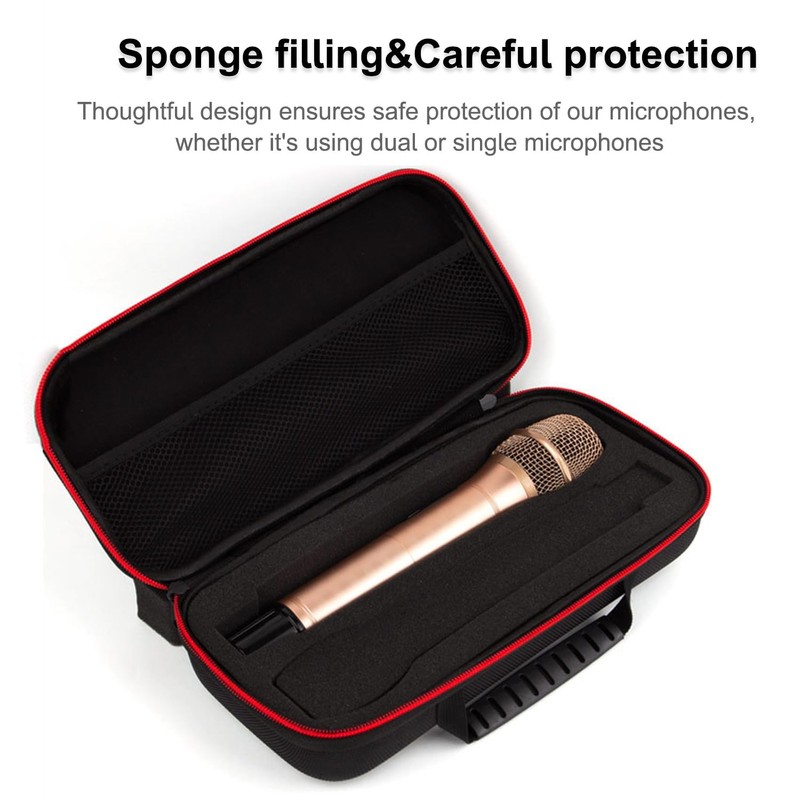 The Microphone Storage Box Equipped with a convenient handle for easy transportation and storage. Features dual zippers for easy access and storage of all parts.Two internal microphone slots on one side, keeping them separate from the accessories on the other side.The microphone case is crafted with high-quality EVA and sponge materials, making it drop-resistant and incredibly durable. It protects the microphone from drops, scratches and damage.