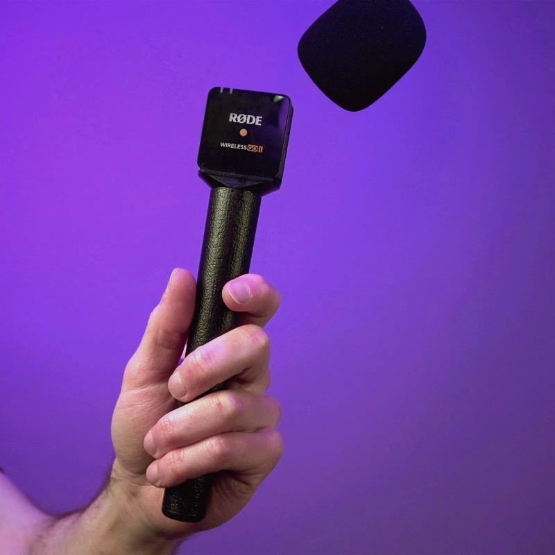 Handheld interview adapter for the Rode Wireless PRO, GO, GO II, and ME microphone systems.