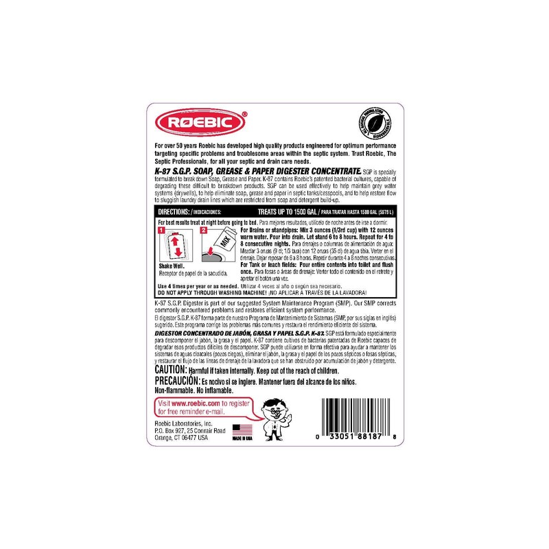 A concentrated easy to use K-87 is a unique product that degrades soaps, grease and paper that can clog plumbing systems. Soaps and grease tend to accumulate and "crust" in pipes causing slow drainage and killing the beneficial bacteria in wastewater systems. This combination bacteria lives on soaps and grease and enzymatically breaks them down. Adding this product to your system, will fortify your system's bacteria and help ensure problem free septic system operations. A concentrated easy to use K-87 is a unique product that degrades soaps, grease and paper that can clog plumbing systems. Soaps and grease tend to accumulate and "crust" in pipes causing slow drainage and killing the beneficial bacteria in wastewater systems. This combination bacteria lives on soaps and grease and enzymatically breaks them down. Adding this product to your system, will fortify your system's bacteria and help ensure problem free septic system operations.