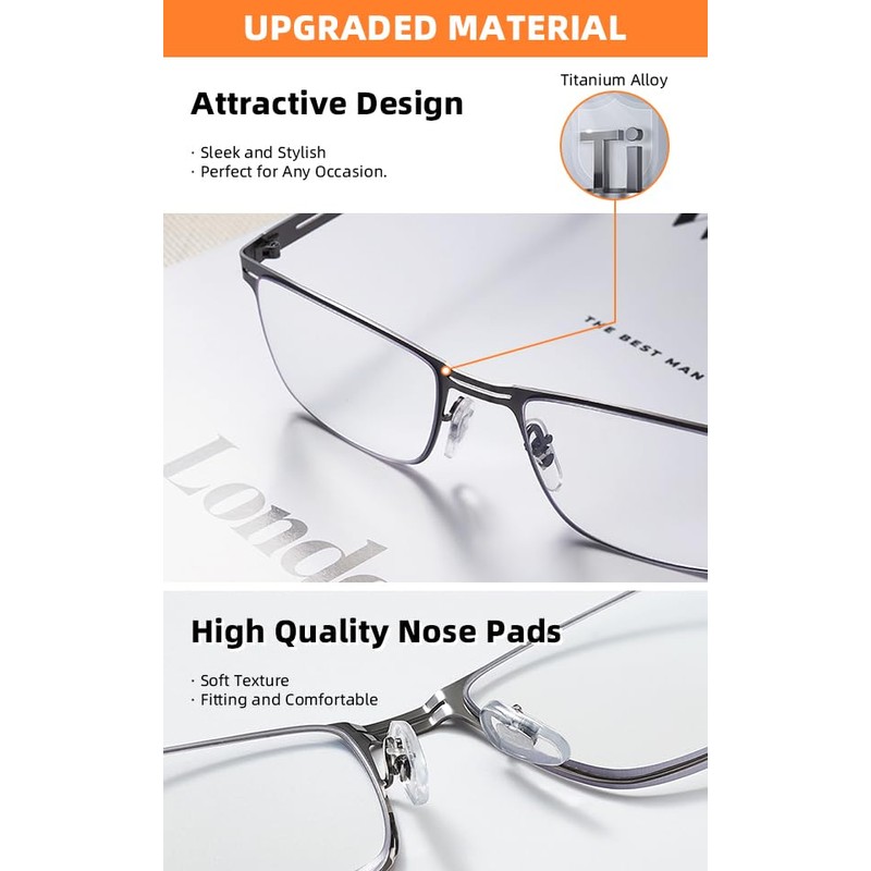 • 【Durable & Lightweight & Comfortable】Bifocal reading glasses for men are made of metal durable ultra lightweight material, adjustable silicone nose pads, metal hinges and non-slip temples. Keeping you comfortable. Cheaters reading glasses are designed with stylish, scratch resistant frames. The anti blue light lenses are scratch-resistant and wear resistant, with a clear view that reproduces true colors and is not easy to break; there is little to no pressure on the nose, ears and head.