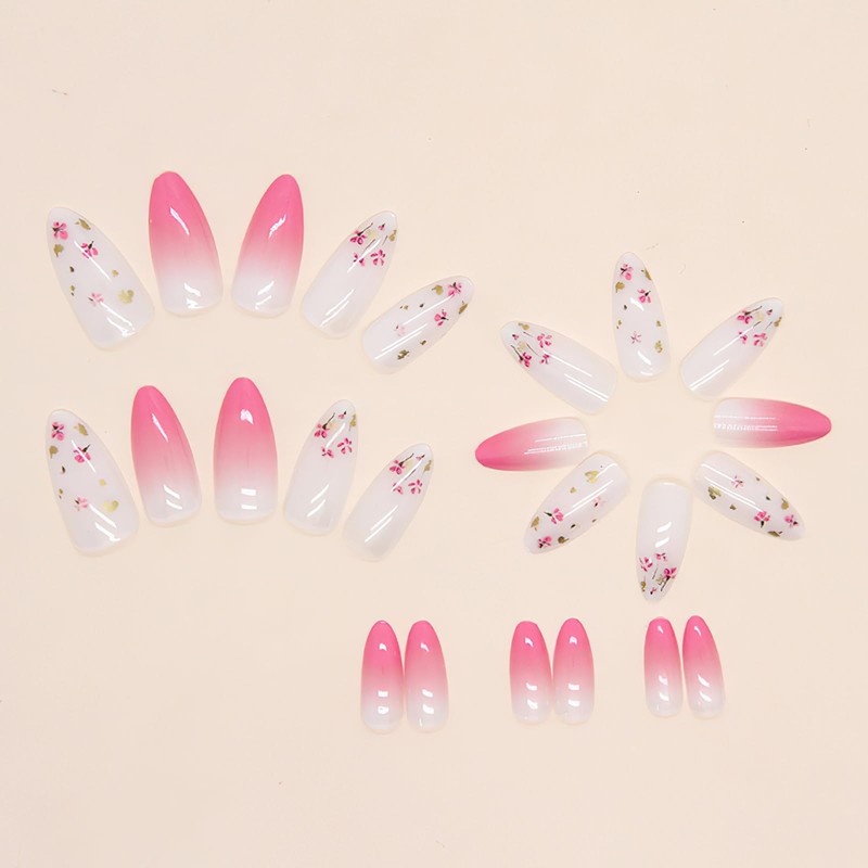 ROFIBUT Flower Press on Nails Medium Almond Fake Nails Glossy Gradient Pink Glue on Nails Small Floral False Nails Pink French Full Cover Stick on Nails for Women Girls Manicure Decoration 24Pcs