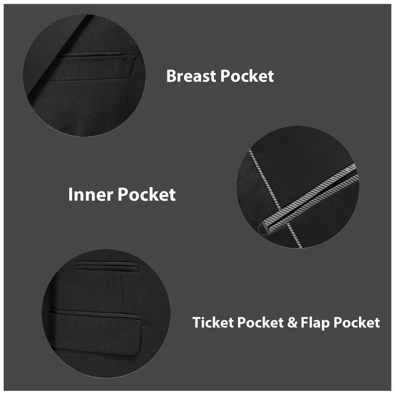 • POKECTS DETAIL - JACKET have 2 side pockets 1 ticket pocket 1 chest pocket and 2 inside pockets; VEST have 2 side pockets 1 ticket pocket and 1 fake chest pocket; PANTS have 2 insert pockets and 2 back pockets