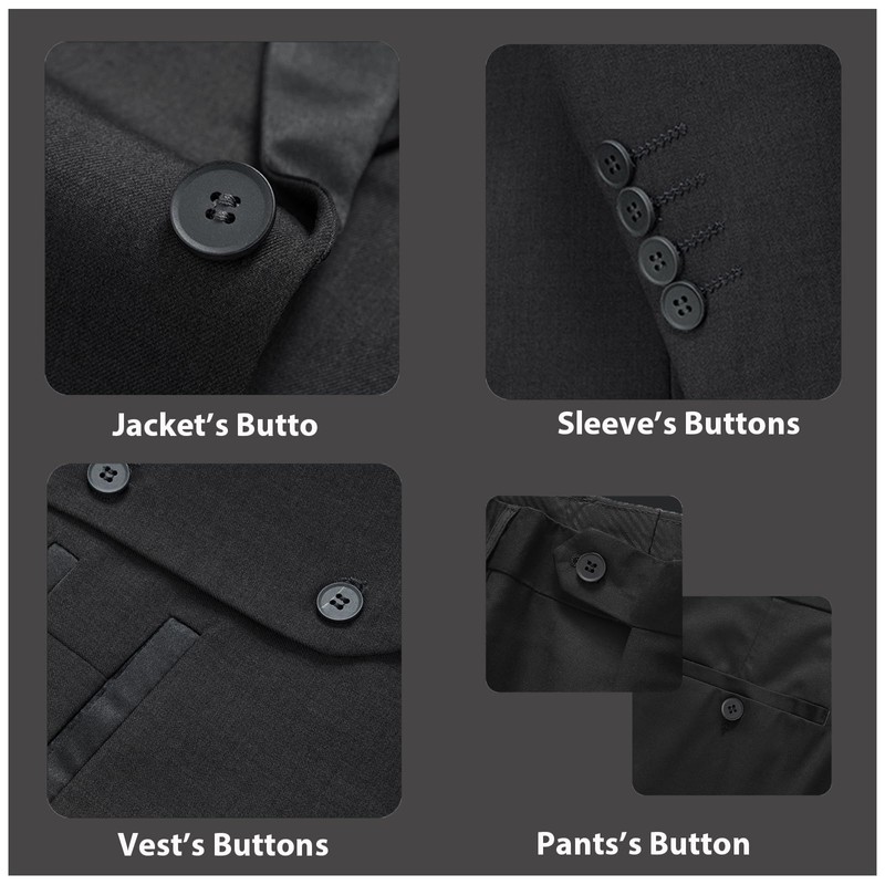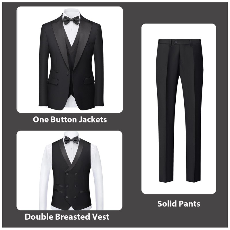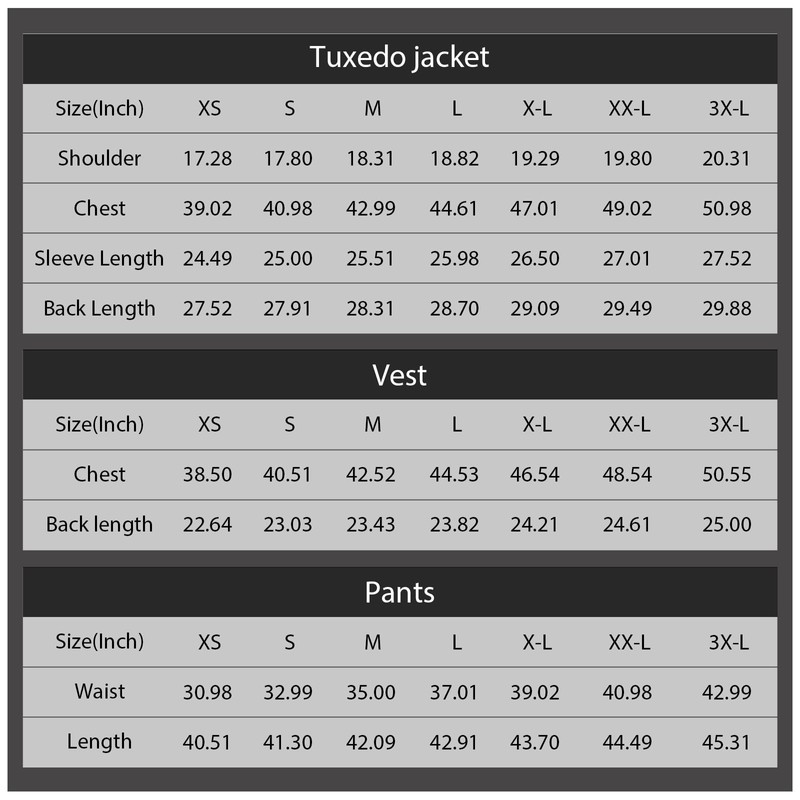 • NOTE TIPS - This 3 piece set includes a tuxedo jacket, a vest, and a pair of pants, excluding the bow tie. Please feel free to contact us directly if you have any questions when choosing your size.