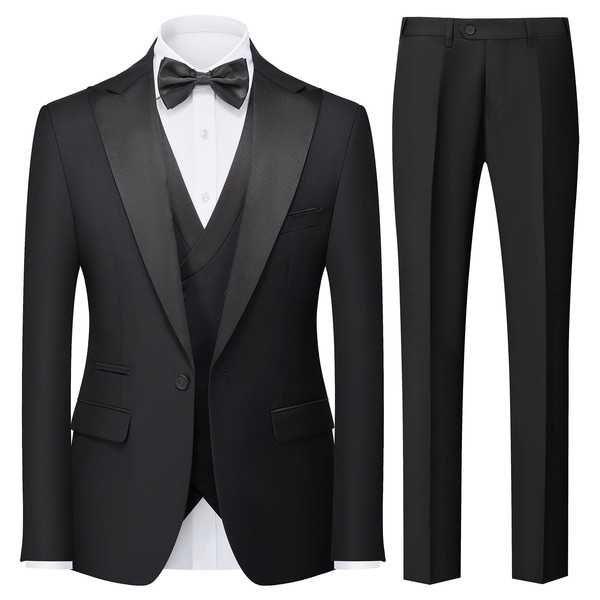 Rogers & Morris Tuxedo Suits for Men Solid 3 Piece Slim FitFormal Set Peak Lapels One Button Jacket Vest Pants Black M