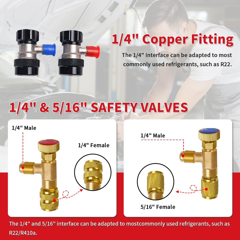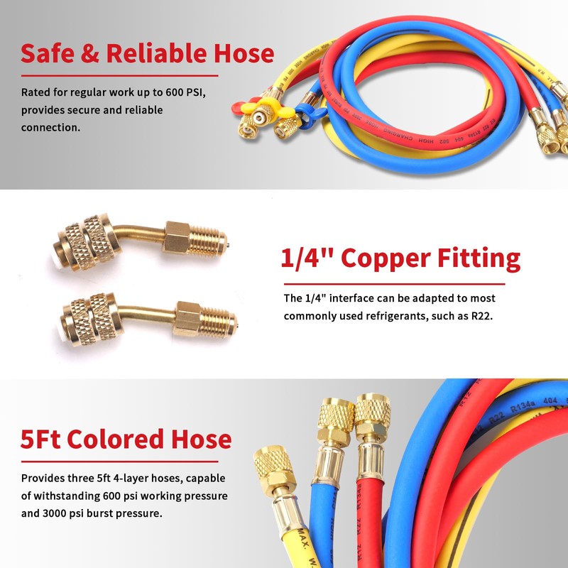 - COMPLETE GAUGE IN SET: Our AC manifold kit includes: 1 x 3 way AC gauge, 3 x 5 FT colored hoses, 2 x R410a/R22 safety valves, 2 x R134a adapters, 1x universal can tap, 1 x valve core remover, 5 x R410a/R32 adapters. Can meet your tool usage needs during the air conditioning refrigerant filling process.