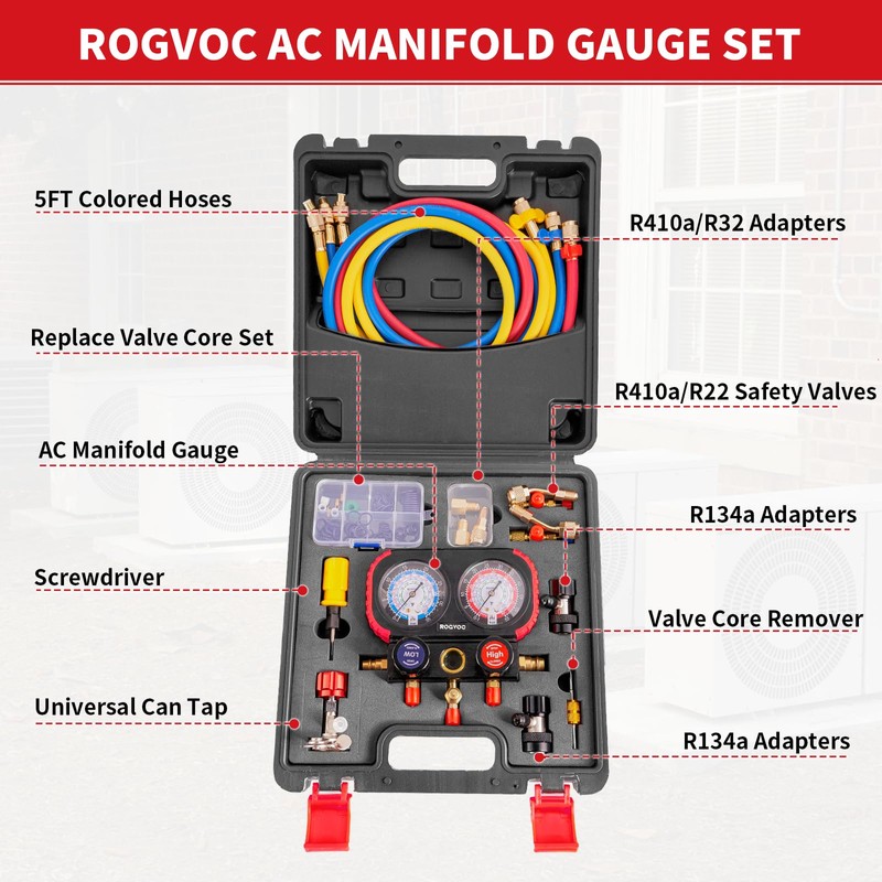 - AC / HVAC GAUGE SET: Rogvoc professional automotive air conditioning manifold gauge set will compatible with R22/R410a/R134a refrigerants. Fit for HVAC freon refrigerant recharge.