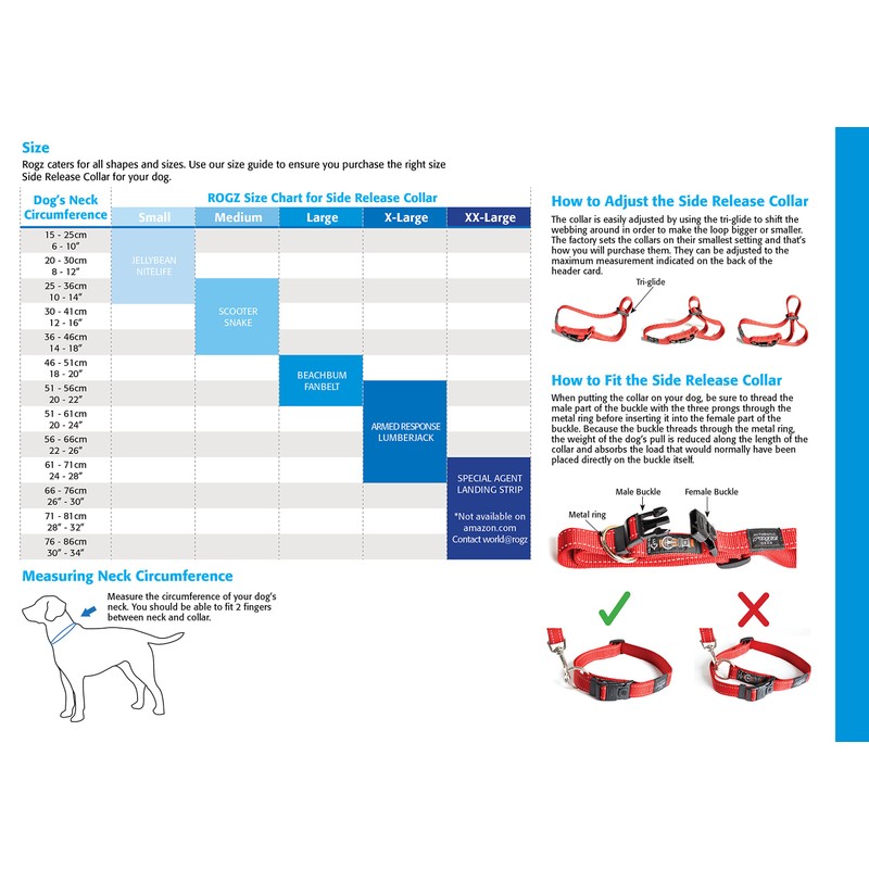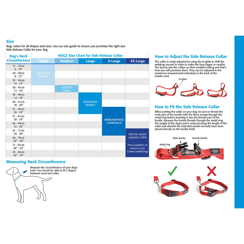 It's SAFETY FIRST with the Rogz Highly Reflective Utility Range, which is both the black tie and the 4x4 of the Rogz range. Timeless and classic, hardy but cool. Never shaken - or stirred. The 5/8" Snake Side-Release Dog Collar with its woven reflective threads stitched into high quality webbing is the ideal solution for the teenagers of the Dog Species. Straight-forward and durable with ultimate night time visibilty. Standard features include Ergonomic, contoured plastic components ensuring that every Rogz collar fits as snug as a pug in a rug and Custom-branded die cast ring (no welding) with electroplated chrome for a rust, tarnish free finish. All joins are box stitched for extra strength and a quality finish. Note that this range has to be turned inside out when operating in stealth mode as the reflective stitching is only found on one side. The 5/8" Snake collar adjusts for a neck size of 12-15". It's suitable for Maltese Poodle, Terrier, Jack Russell, Scotty, Pug and similar sized breeds. Buckle-Breaking strength tested at 264lbs-271lbs from a direct pull.