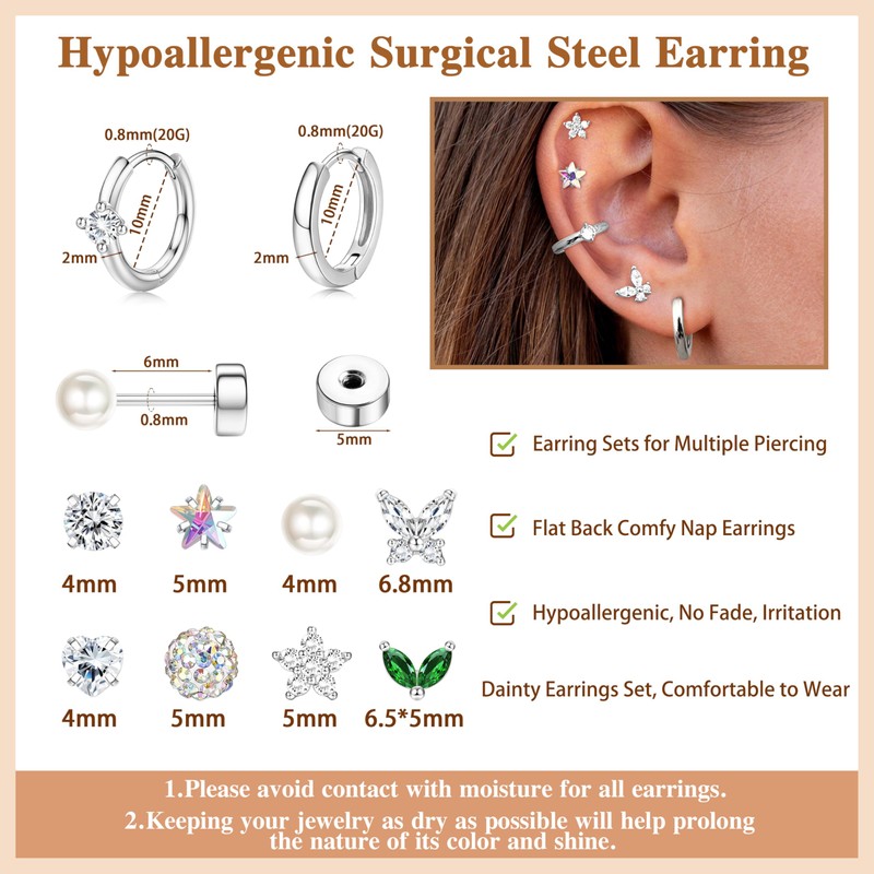 Roheafer 316L Edelstahl Flatback Ohrstecker Hautfreundlich mit 14K Gold Piercing-Stacks für Helix Tragus Mini Hoops im Trenddesign Style A Argenté