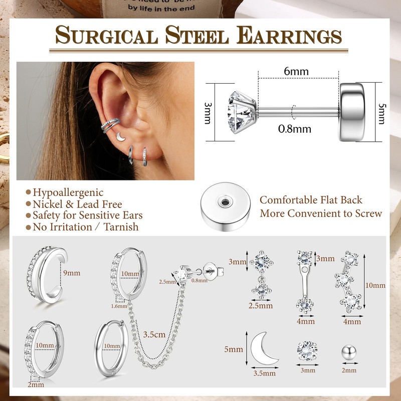 - Cartilage Earring Sets for Multiple Piercing: You can get 6 pairs stud earrings, 2 pairs cartilage hoop earrings, 1 pairs dangle chain hoop studs, 2pcs ear cuff. Stud and hoop earrings set for multiple piercings, such as cartilage earring, helix piercing, first hole, second hole, third hole, tragus piercing, etc. Feel free to match your style!