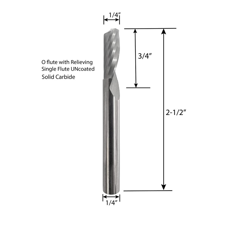 - Solid Carbide Spiral Router Bit with 1/4inch Shank and 1/4 inch Cutting Diameter, 3/4 inch Cutting Length, 2-1/2" inch for Total Length with relieving .