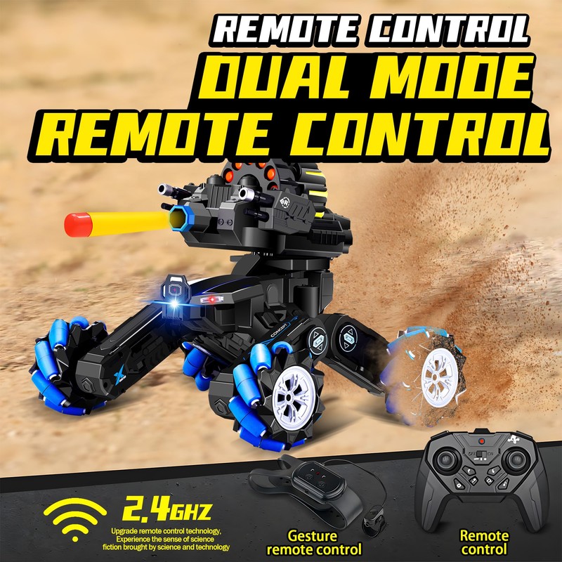 - 【Double Control Modes】Our Gesutre sencing RC tank car is upgraded with 2 control ways: gravity rover control and remote controller. You just need to wear a gesture-sensing watch and give a gesture, the remote-control car will move accordingly or you can use remote controller. They both use 2.4GHZ transmitter strength that is sensitive and responsive, it can be maneuvered even from a far distance. Note:Each remote controller can only be connected with one stunt car.