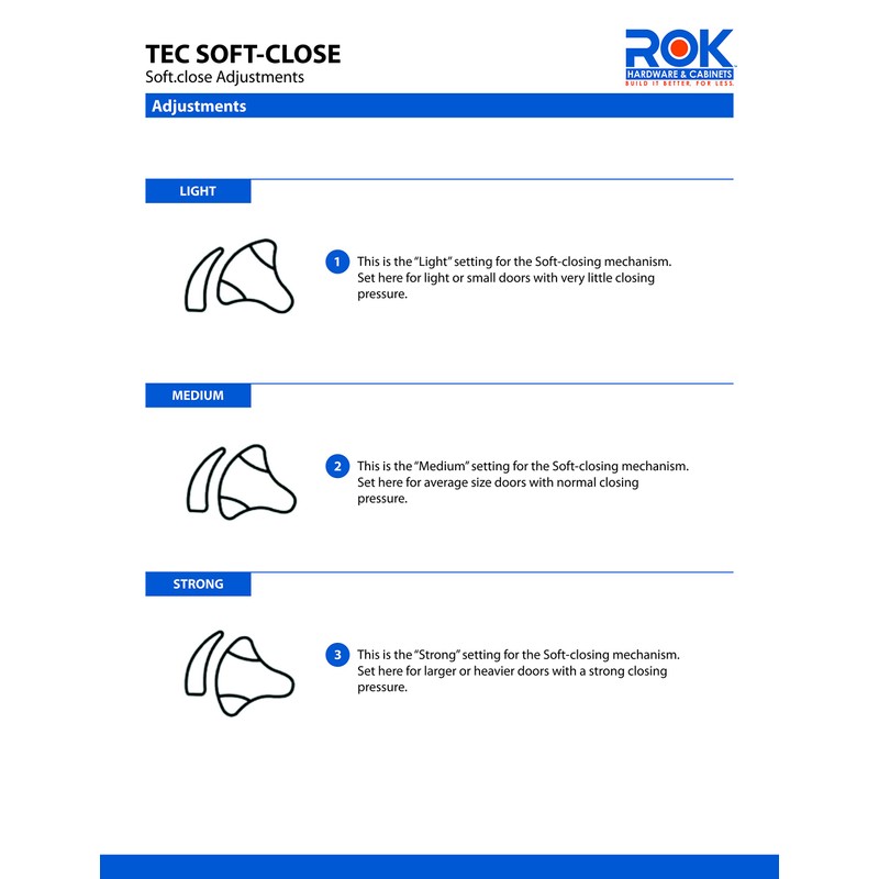 • 1-1/2 in overlay soft closing hinge with custom 3 level soft close strength switch
