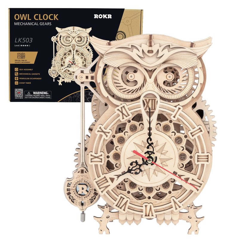 ROKR 3D Wooden Puzzle for Adults Owl Clock Model Kit Desk Clock Home Decor Unique Gift for Kids on Birthday/Christmas Day