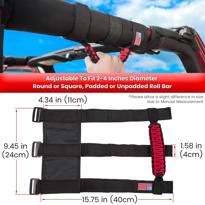 - Great Compatibility — Perfectly fit for 1955-2023 Jeep Wrangler JK JKU JL JLU TJ LJ YJ CJ Sport Sahara Freedom Rubicon Unlimited X Gladiator JT 2-Door and 4-Door, ATV, UTV. Adjustable to fit 2-4 inches diameter round or square, padded or unpadded sports bar/roll bar.