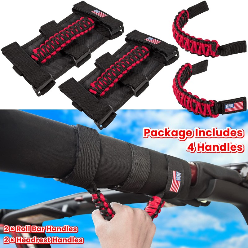 Roll Bar Grab Handles+Headrest Grip Handle for Jeep Wrangler YJ TJ JK JKU JL JLU Sport Sahara Freedom Rubicon Unlimited X Gladiator JT 1955-2023 UTV ATV Premium Paracord US Flag (Red 4 Pack)