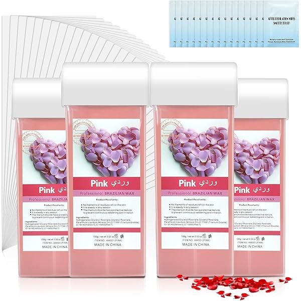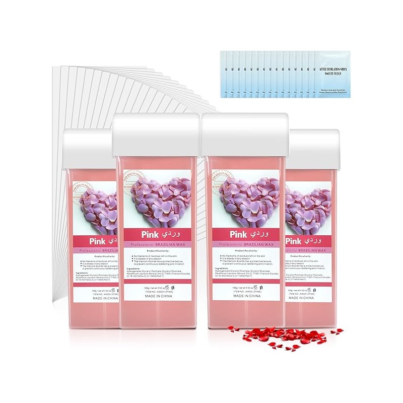 Roll On Wax, Hair Removal Wax Cartridges with Strips 50Pcs and Wax Wipes 16Pcs, Depilatory Wax Roller Refill 4 Pack, Waxing Kit for Leg, Arm, Underarm
