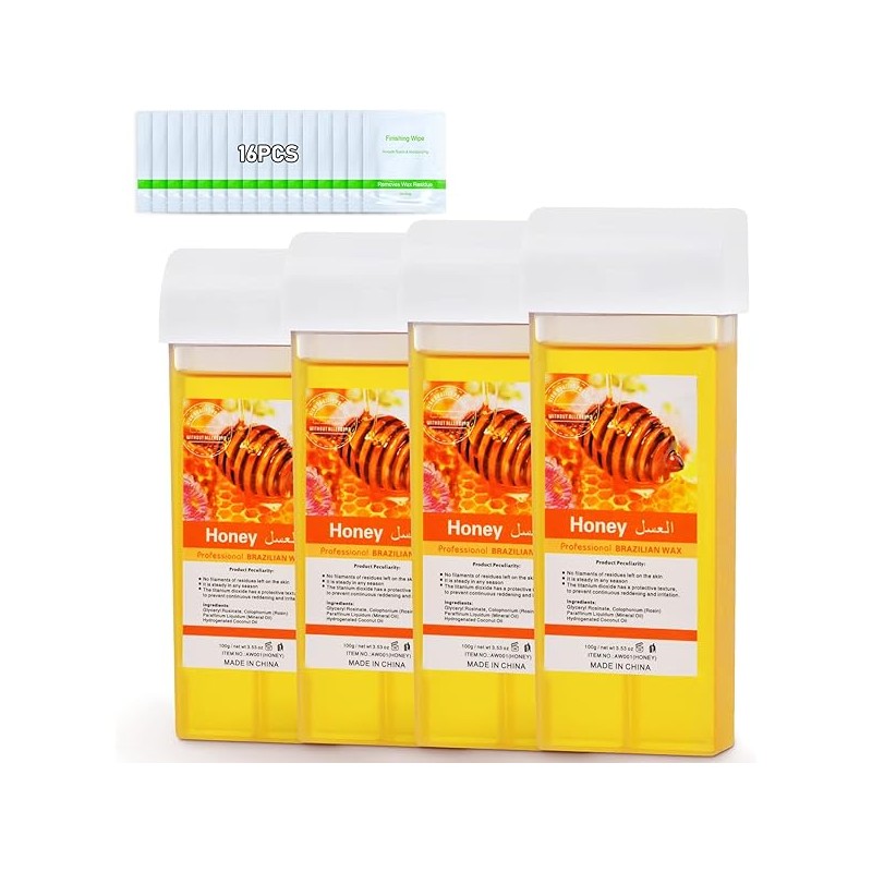 Roll On Wax, Honey Hair Removal Wax Cartridge, Depilatory Wax Roller Refill, 4 Pack - 100% Natural Material, Dermatologically Tested, Easy & Safe to Use, For Body Waxing, Leg and Arms