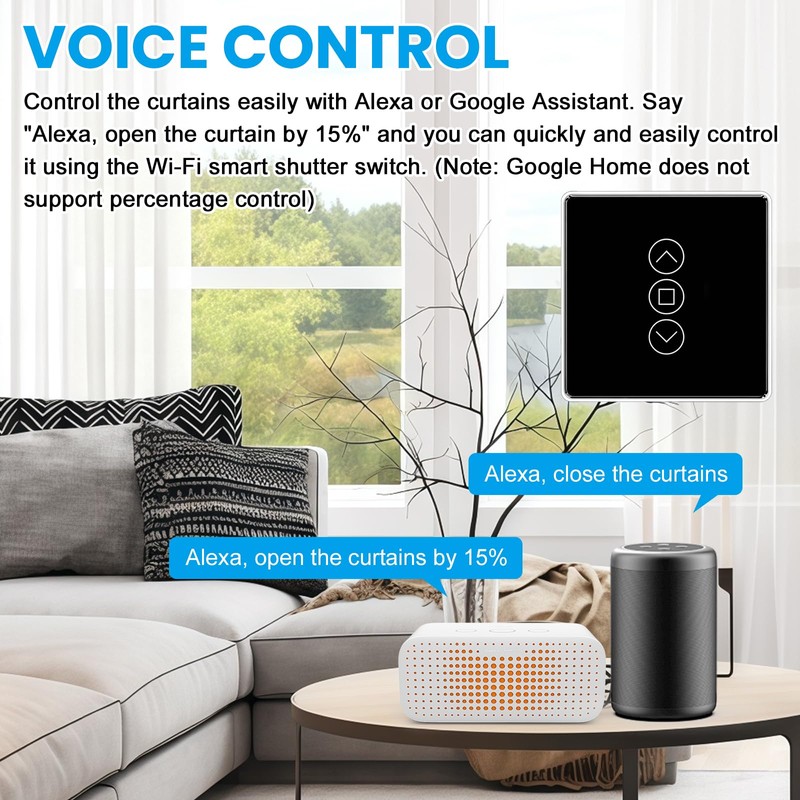 • Sprachsteuerung für bequeme Bedienung: Steuern Sie Ihre Vorhänge mühelos per Alexa oder Google Assistant. Sagen Sie: „Alexa, öffne die Vorhänge um 15%“ für eine schnelle und einfache Steuerung mit dem Wlan Rolladenschalter Smart. (Achtung: Google Home unterstützt keine Prozentsteuerung).