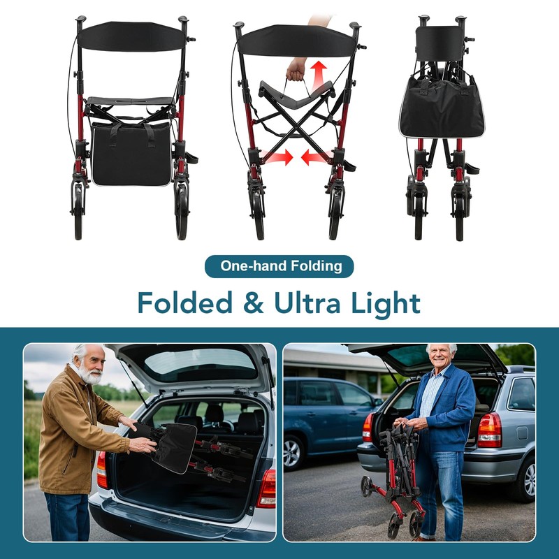 - Compact Folding: Foldable walkers for seniors with seat, pull in the middle for about 10 seconds to retract. Dimensions after folding: 9.5 * 30 * 11.4 ''. Ultra compact and lightweight, suitable for travel and car travel, easy to store.