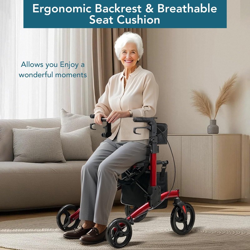 Rollator Walker for Seniors, Folding Rolling Aluminum Walker with 10 '' Non-Pneumatic Tire Wheels, Height Adjustable All Terrain Rolling Walker with Backrest and Cane Holder for Adult, Red