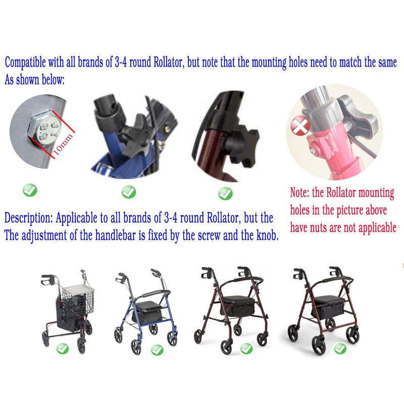 Compatible with all brands of Rollator, but note that the mounting holes need to match the same.All walker parts and accessories are made of reliable materials, sturdy and suitable for daily replacement. The 3 Point Knob kit can be a good replacement for the corresponding parts of your walker arm that are broken, extending the life of the walker.