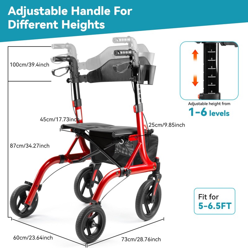 - Dual Height Adjustment & Foldable - Our rollator walker suitable for people of various heights (4'7'' -6'5'') via unique dual adjustment design. The backrest can be adjusted from 32.6" to 38.5" and the handle can be adjusted from 33.8" to 38.6", allowing you to find most comfort height. Weighs 16.5 lb, our rolling walker with seat features a quick-fold design, making it easy to transport and store in the car trunk